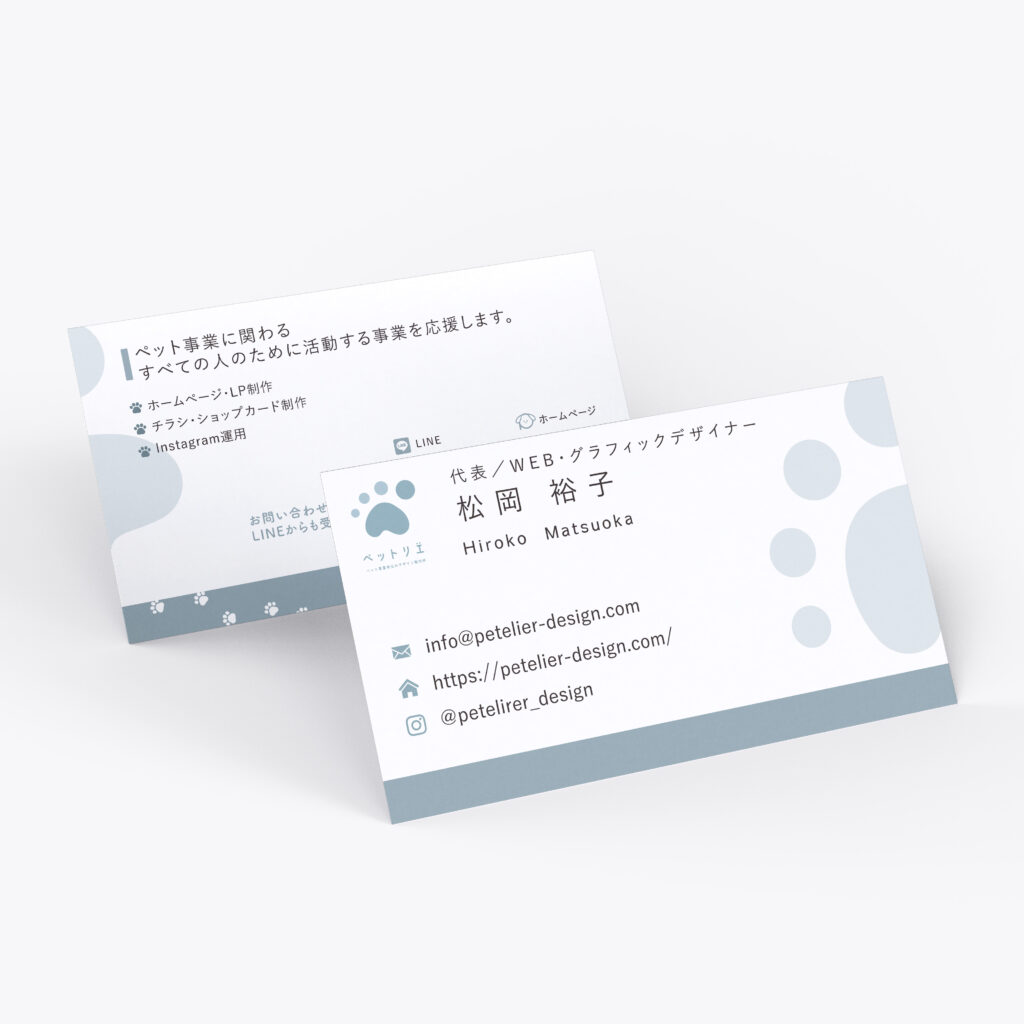 やさしいブルーとシンプルなレイアウトで信頼感を大切にしつつ、裏面には対応業務やSNS導線を分かりやすく整理。かわいらしさと実用性を両立した名刺に仕上げています。