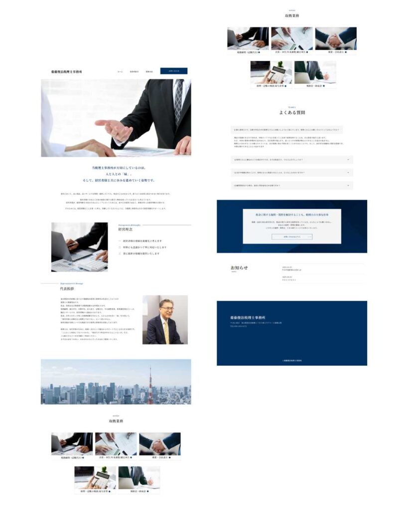 - さらに、各セクションの配置や余白、視線の流れを意識することで、事務所の強みやサービス内容、お問い合わせへの導線まで自然に読み進められる構成に仕上げました。