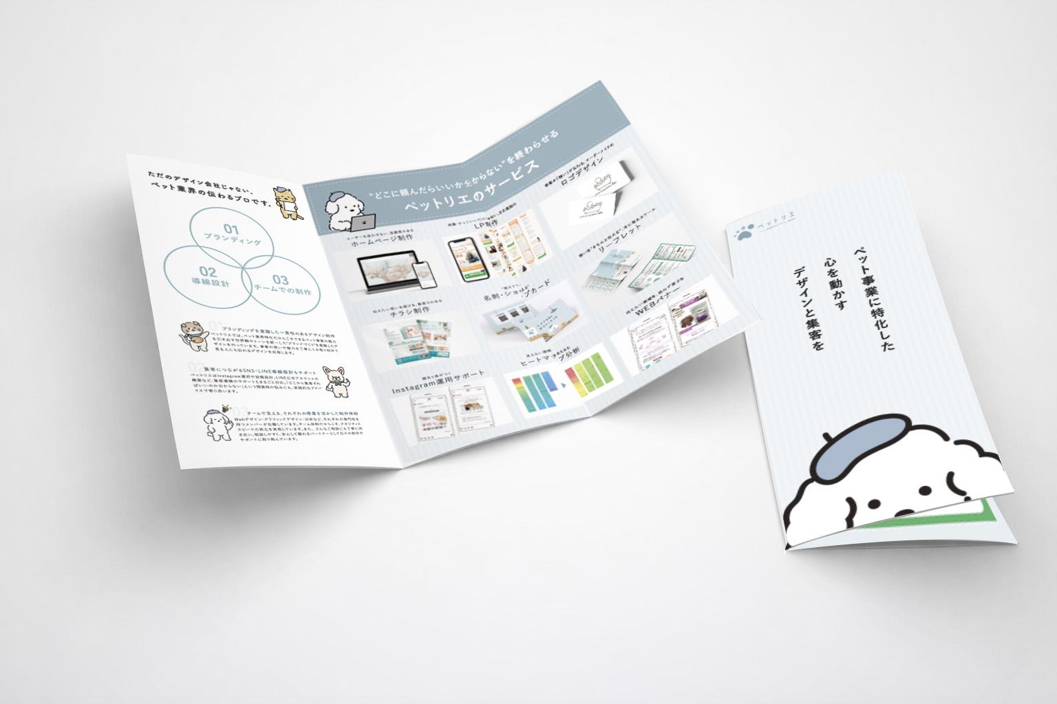 所属するチーム(ペットリエ)の展示会用の三つ折りパンフレットを制作させていただきました。